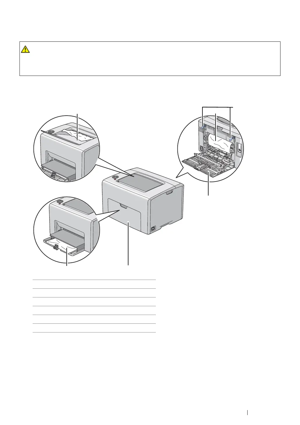 • Do not attempt to clear any jams using tools or instruments. This may permanently damage the printer.