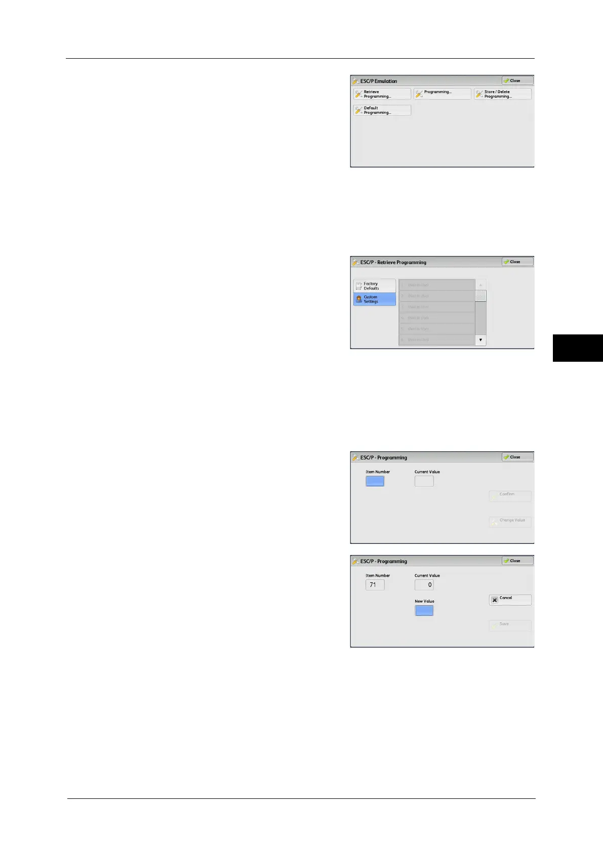 For the item numbers that can be configured in each mode menu, refer to "ESC/P-K Emulation Settings" (P.511), "PDF Direct