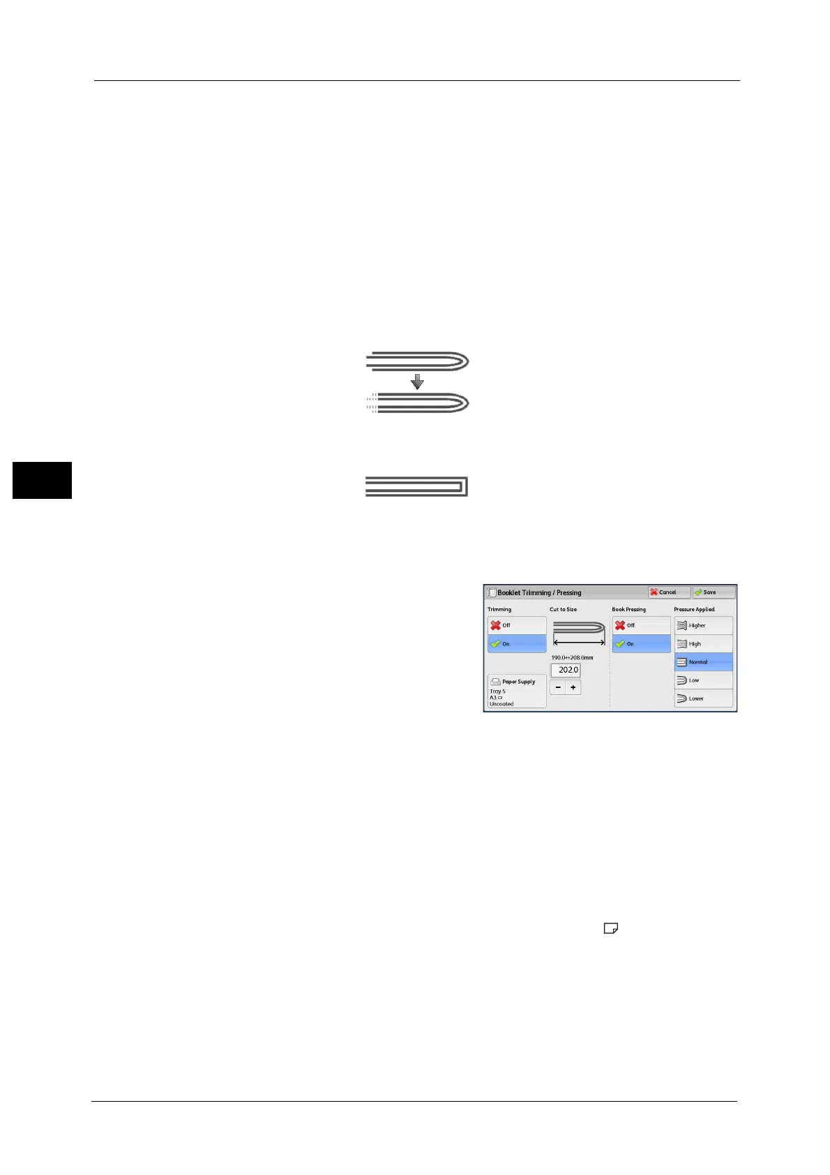 Refer to "[Booklet Trimming/Pressing] Screen" (P.178).