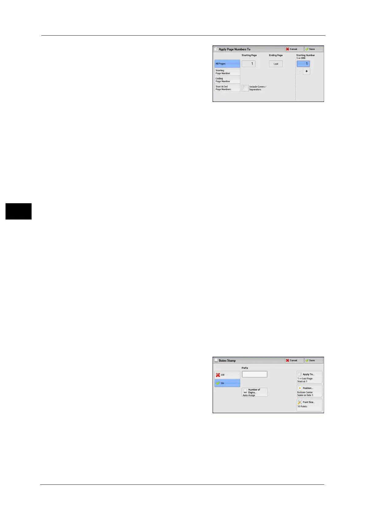 This screen allows you to add prefix text and page numbers onto copies.