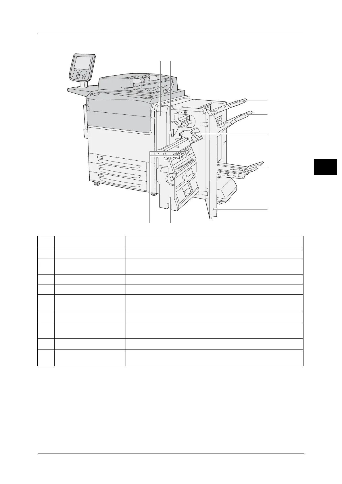 7 Finisher front door Open this door to clear paper or staple jams, replace staples, or discard