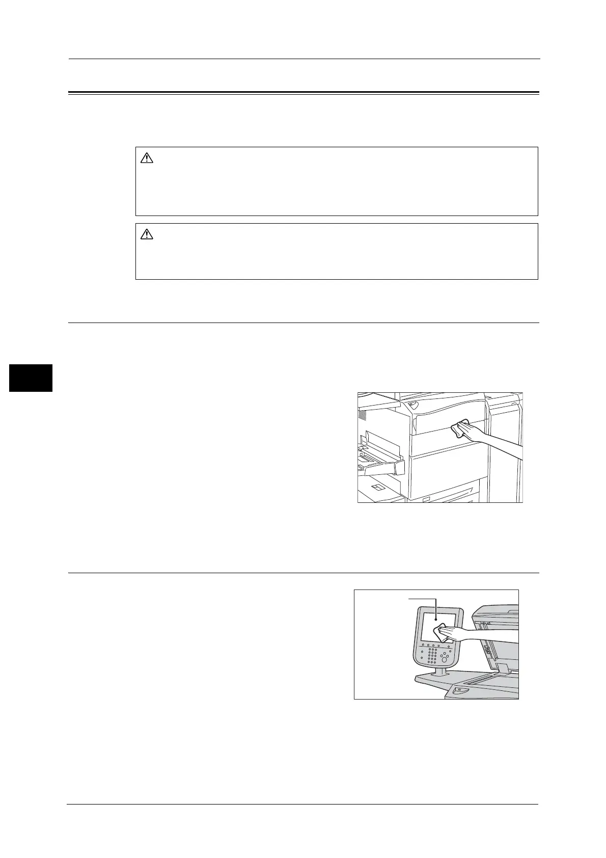• Cleaning the touch screen with an excessive force may cause the screen to be damaged. Wipe the