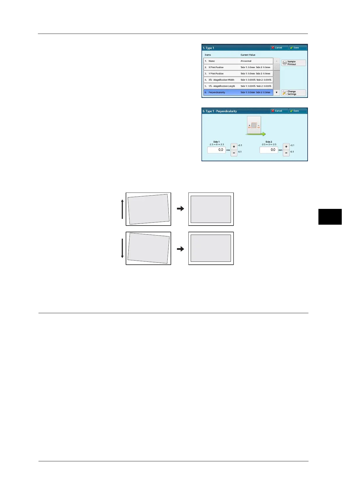 Adjust image skewing (tilt extent) in 0.1 mm increments for each of sides 1 and 2.