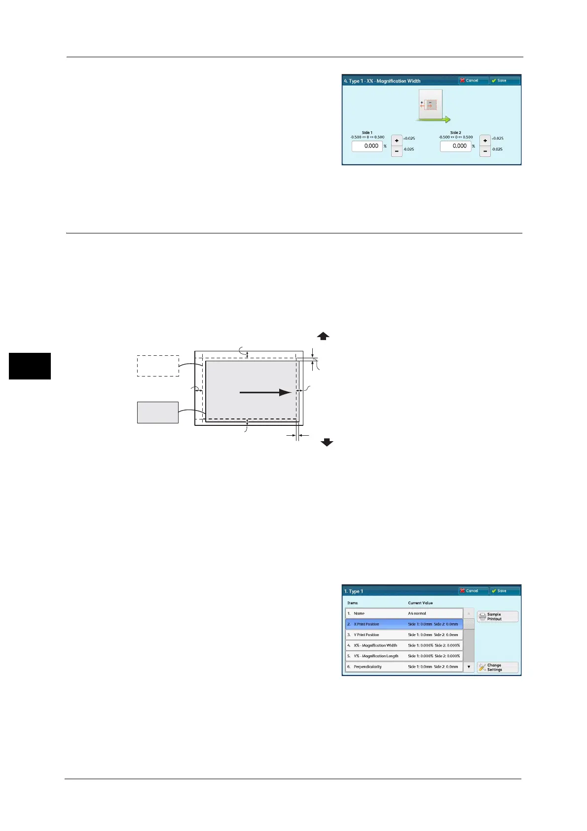 relation to the paper feed direction in 0.1 mm increments for both sides 1 and 2.