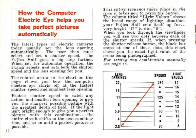 FUJICA HALF - Automatic Exposure Explained; Computer Electric Eye Function; Exposure Combination Chart; Light Value Range