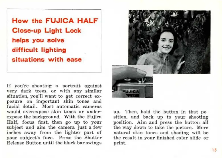 FUJICA HALF - Handling Difficult Lighting; Close-up Light Lock Feature; Achieving Natural Skin Tones