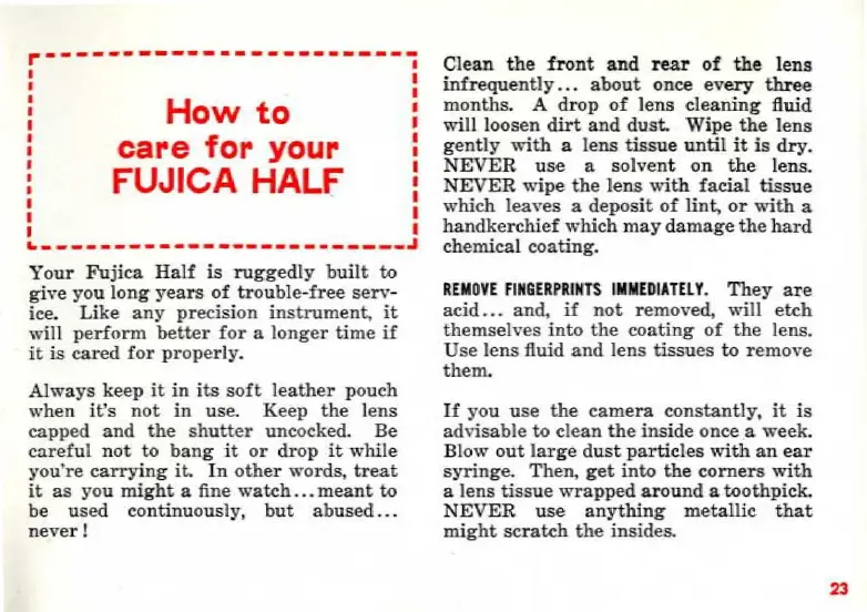 FUJICA HALF - Camera Care and Maintenance; General Care and Storage; Lens Cleaning Procedures; Fingerprint and Internal Cleaning