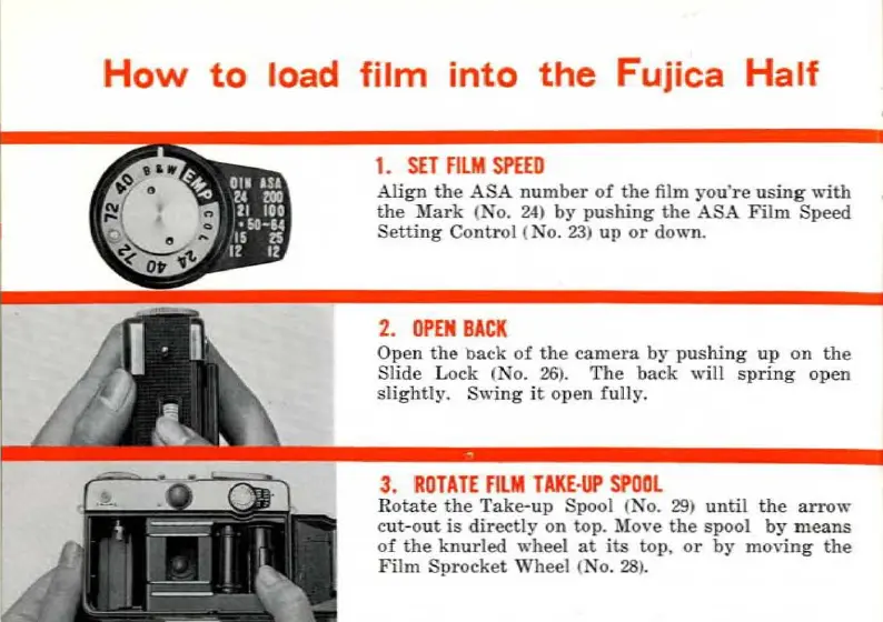 FUJICA HALF - How to Load Film; Setting Film Speed for Loading; Opening the Camera Back; Rotating Film Take-up Spool