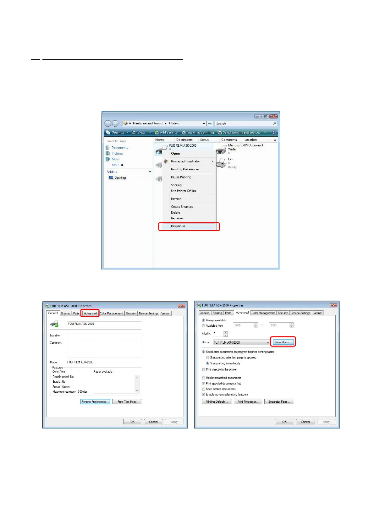 (1) At [Start] menu, select [Printer and Faxes] to open. Select ASK-2000 Printer. With right click,