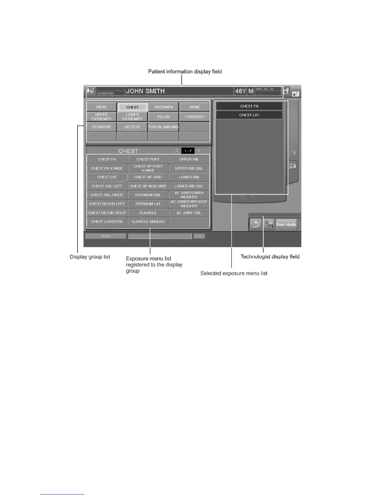 This is a screen for receiving studies. Performs operations of selection of exposure menus.