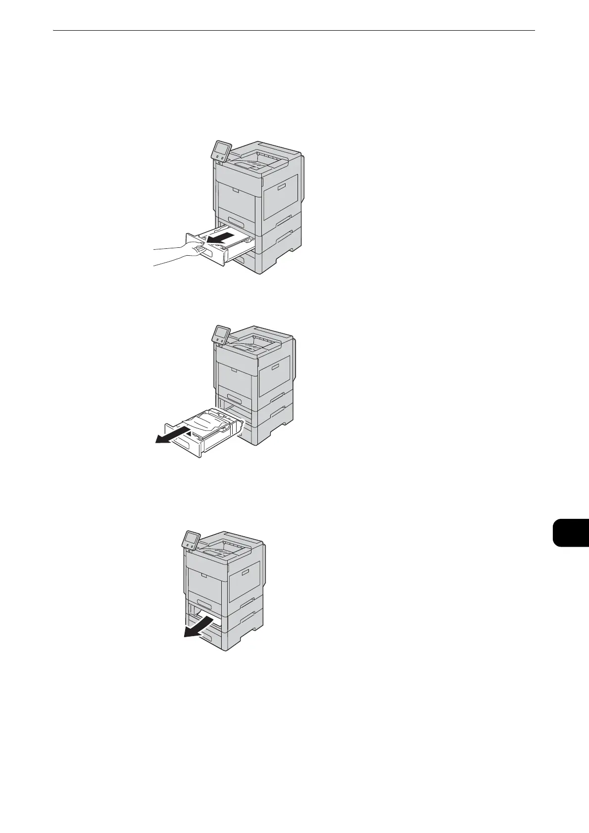 The following describes how to clear paper jams occurring in Trays 2 to 4.