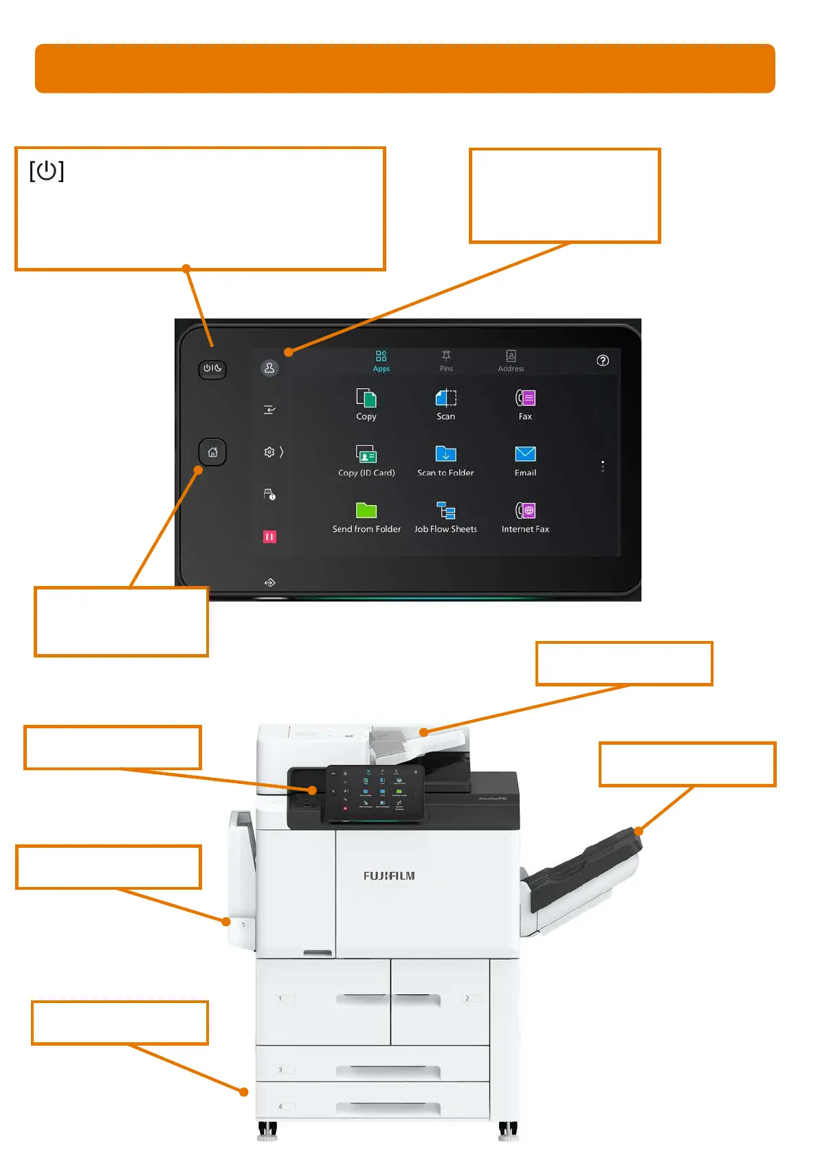 - Press to power on machine or to exit