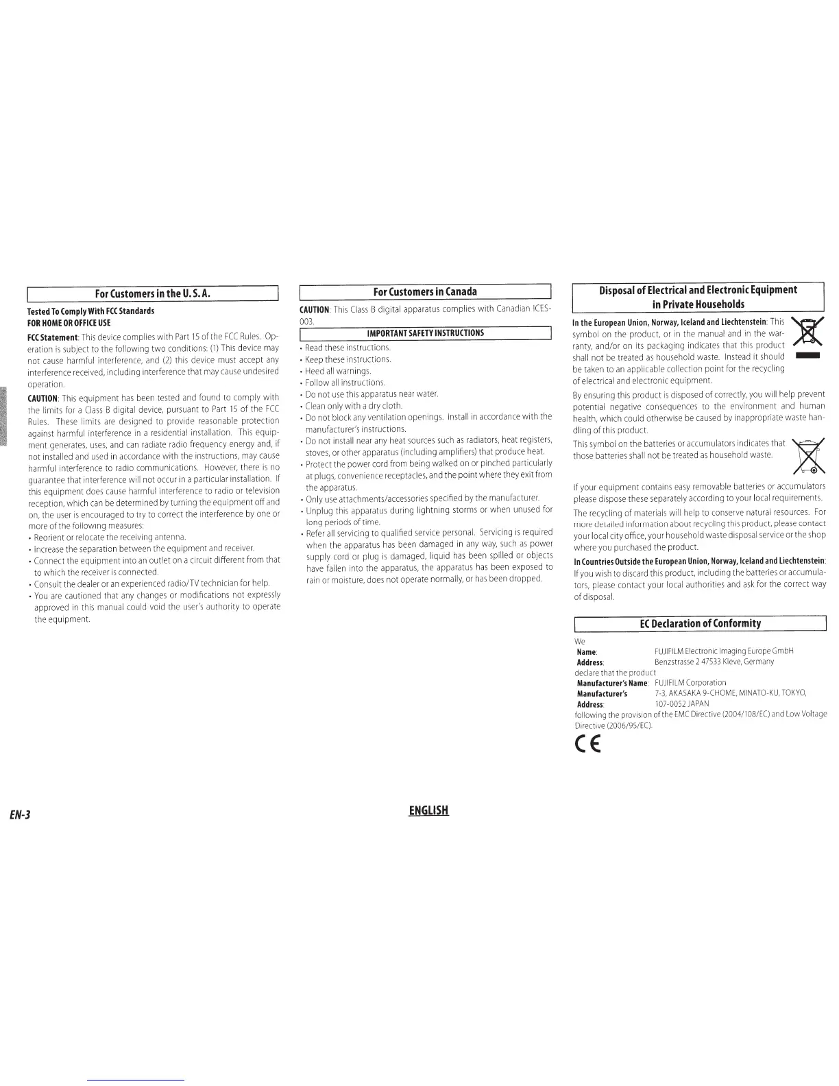 FujiFilm EF-42 - Regulatory Compliance and Disposal; FCC Compliance (USA); Canadian Compliance; Electronic Waste Disposal