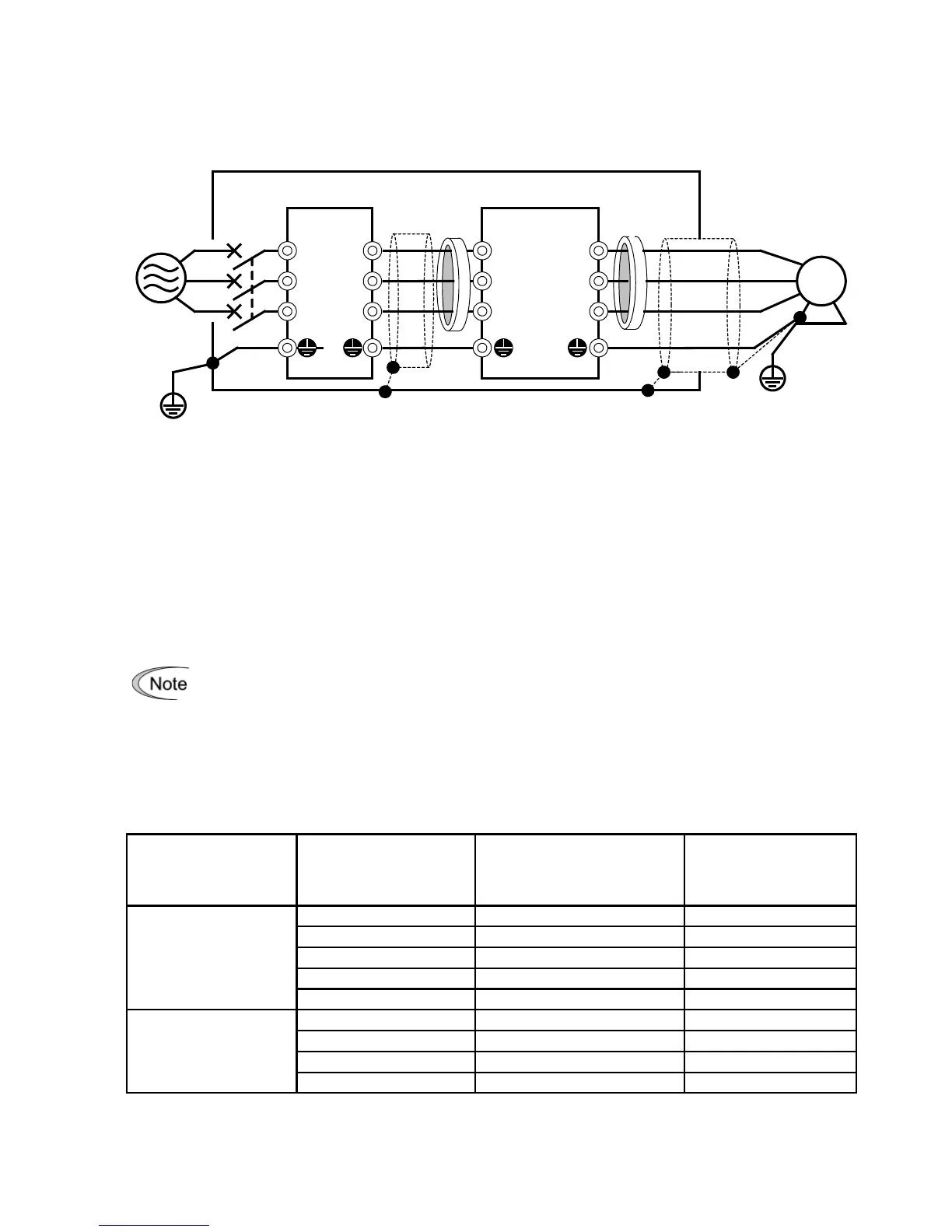 Note 2: Pass the EMC filter output wires (shielded cable and grounding wire in a bundle)