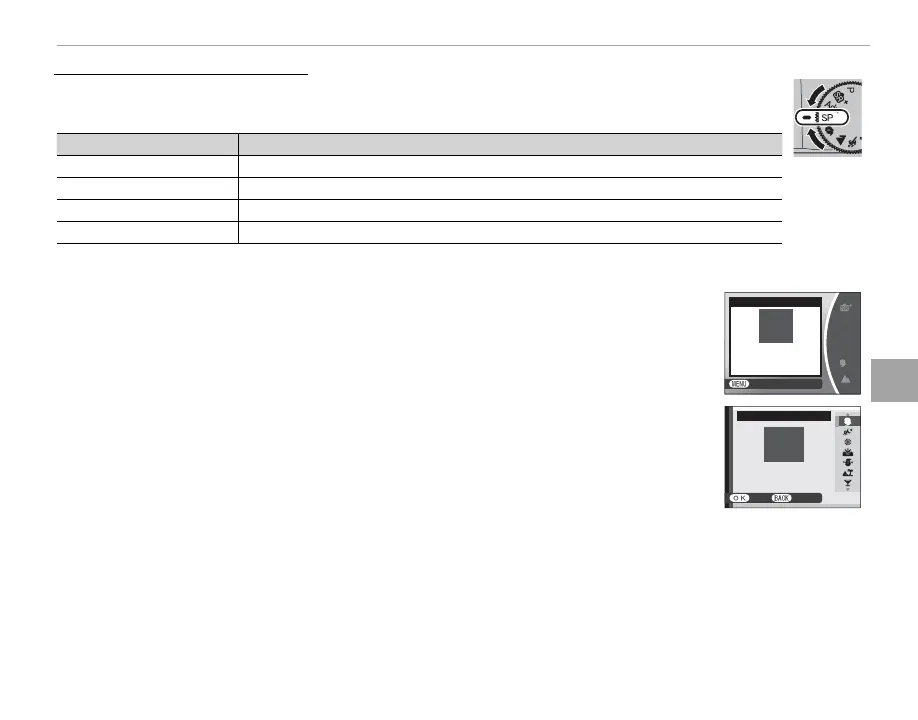 Other scenes can be selected by rotating the mode dial to SP and following the steps below.