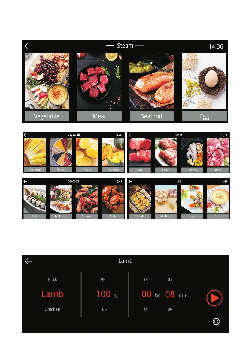 ● Select the kind food to steam, in the sub-menu you can select different foods.