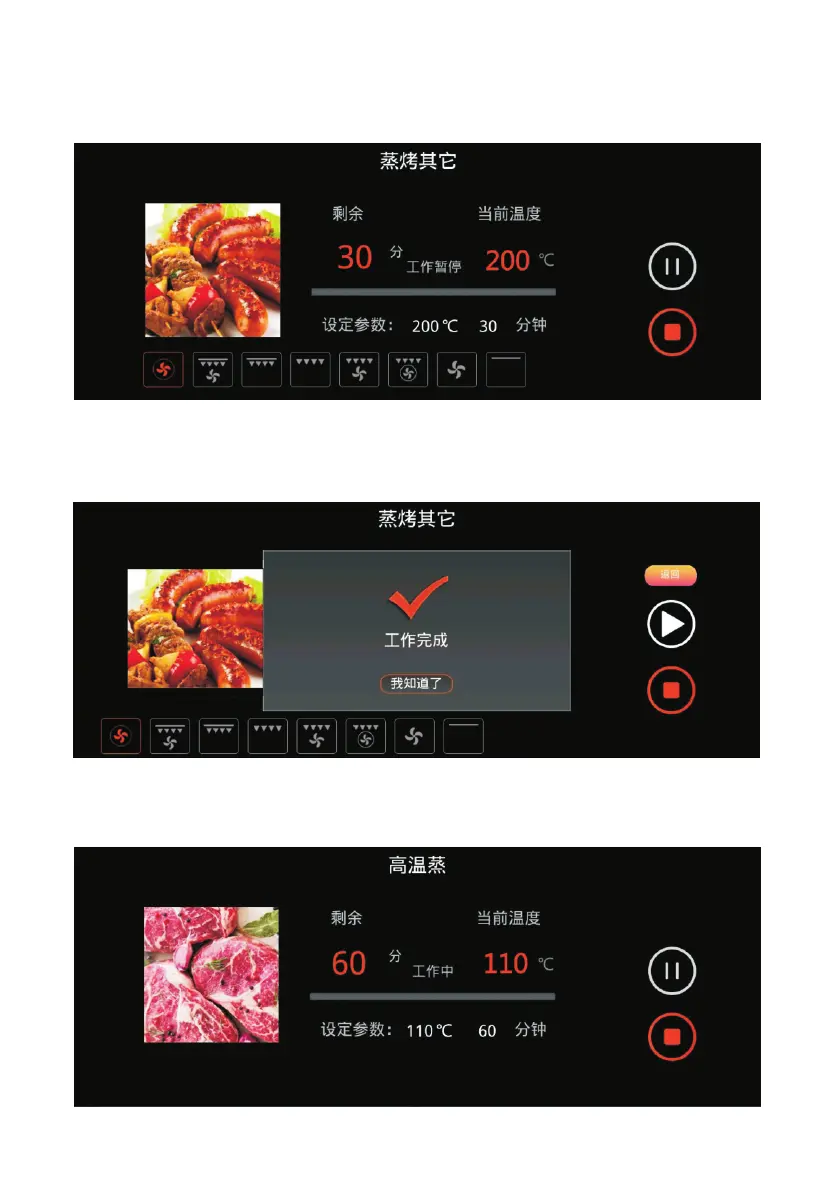 到蒸烤箱运行的时间及当前温度。工作中户随时能暂停及停止工作。