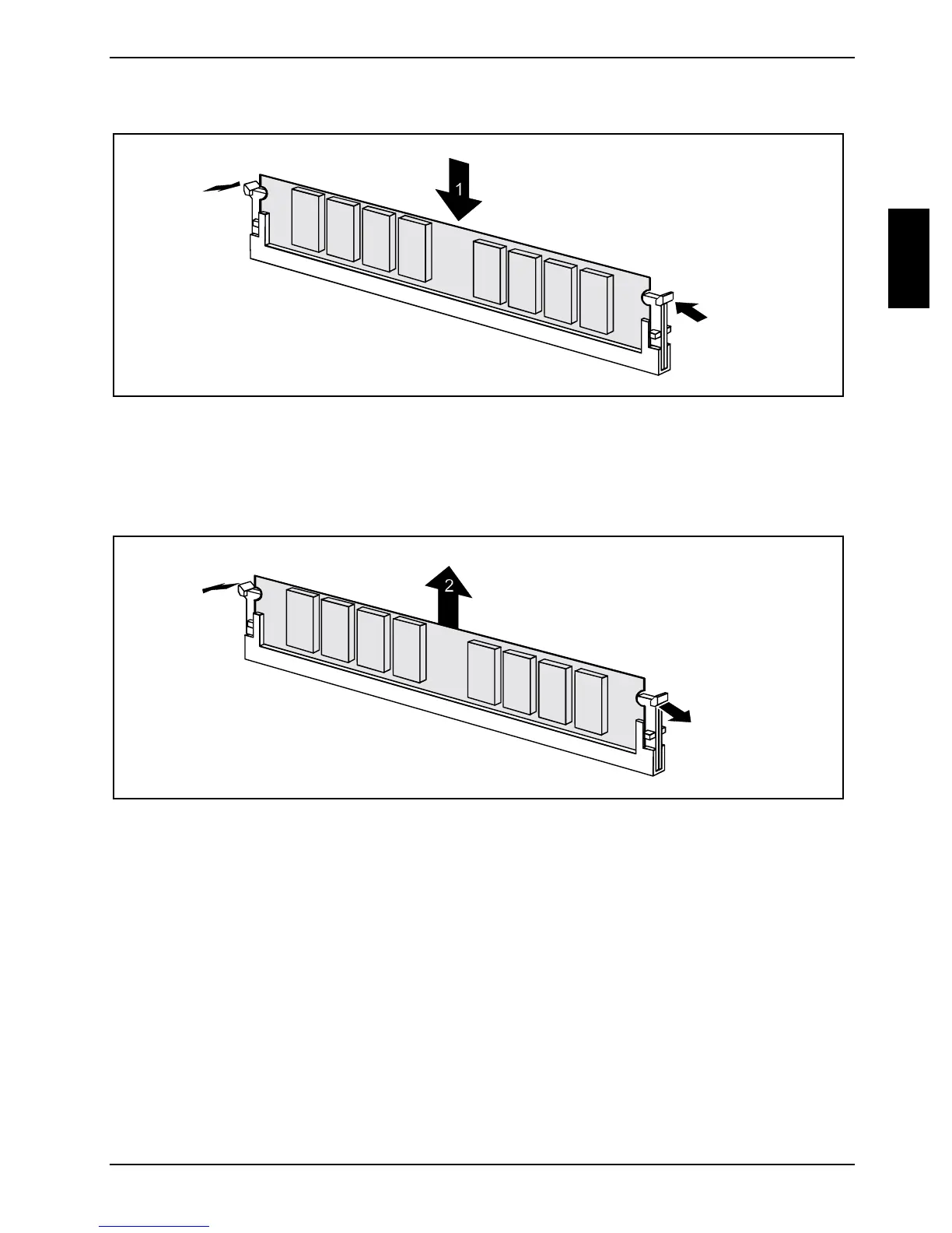 ► At the same time flip the lateral holders upwards until the memory module snaps in place (2).