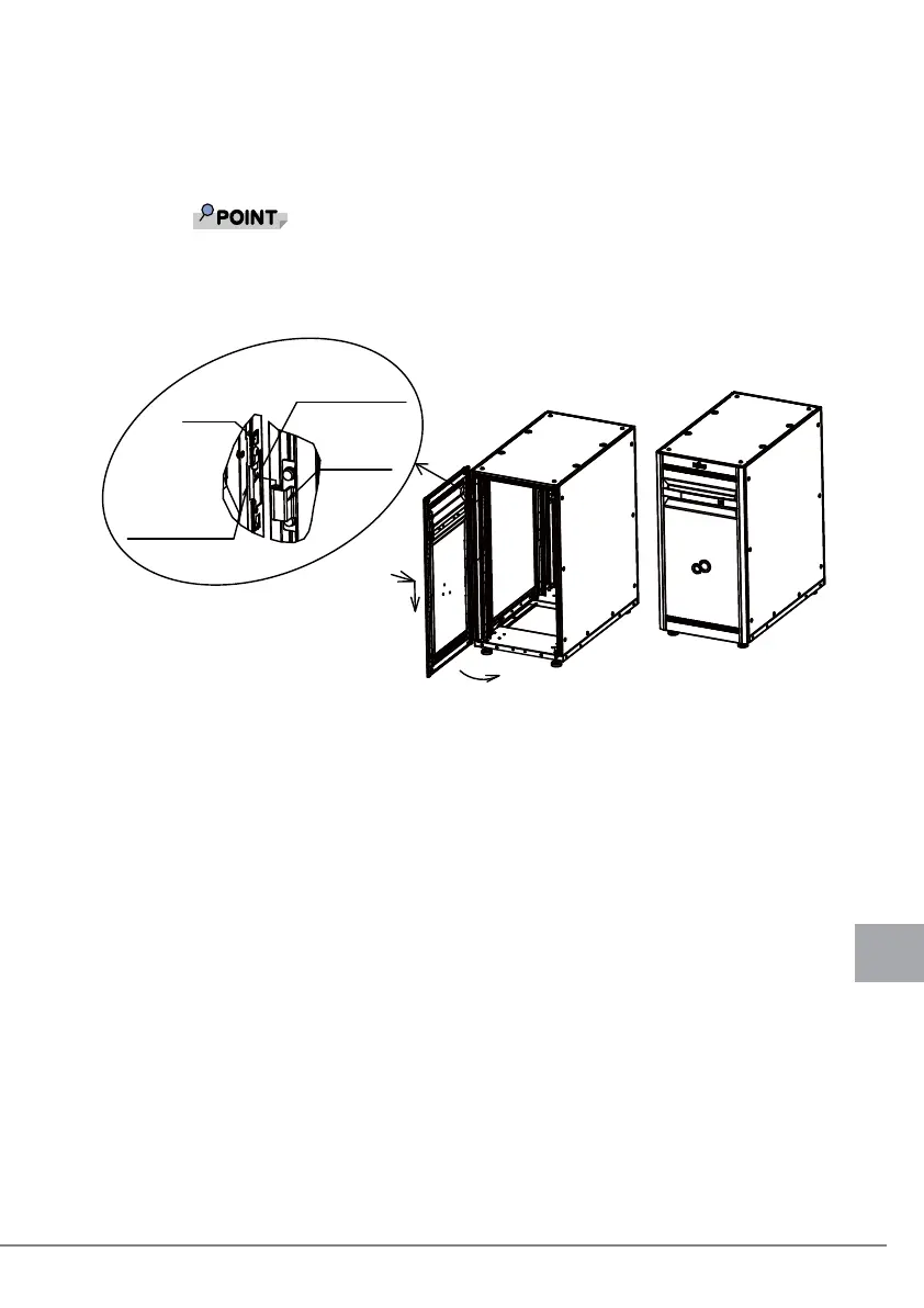 扉を約 90°開いた状態で、扉を横にずらしてラック本体側ヒンジに扉側ヒンジ