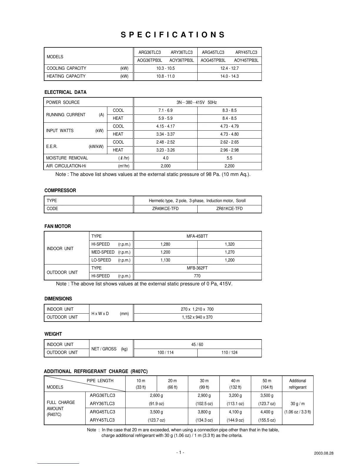 Note : The above list shows values at the external static pressure of 0 Pa, 415V.