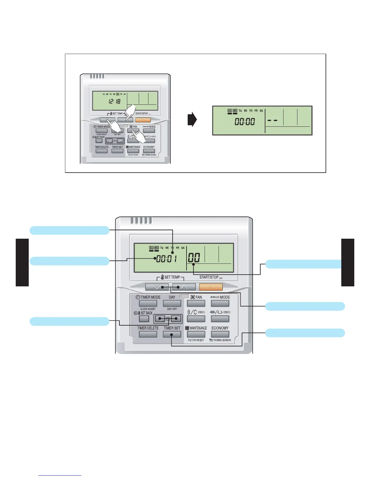 2) To activate the function setting mode, hold down the three buttons "SET TEMP. V", "SET