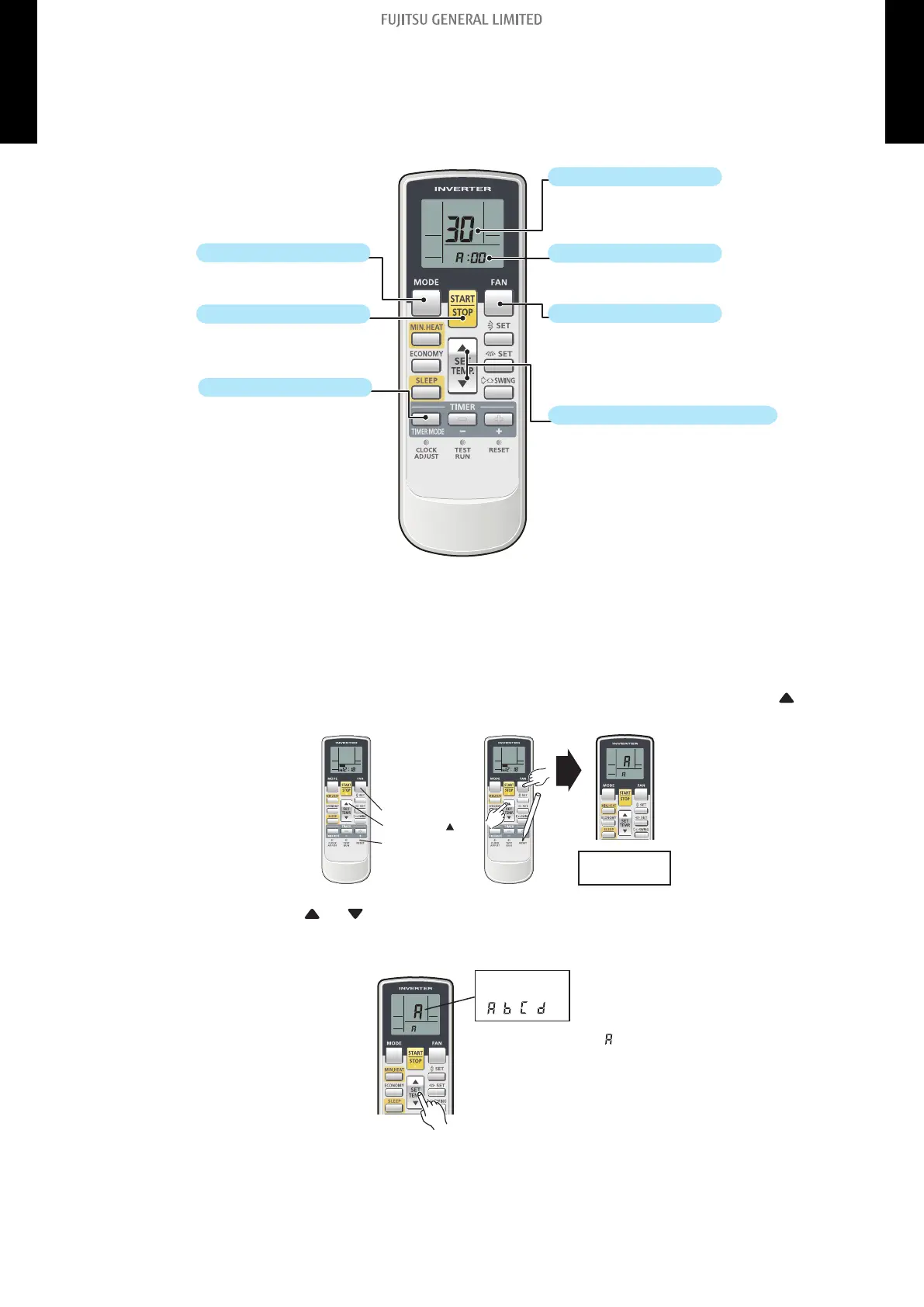 2. To enter the function setting mode, while holding down the FAN and the SET TEMP.