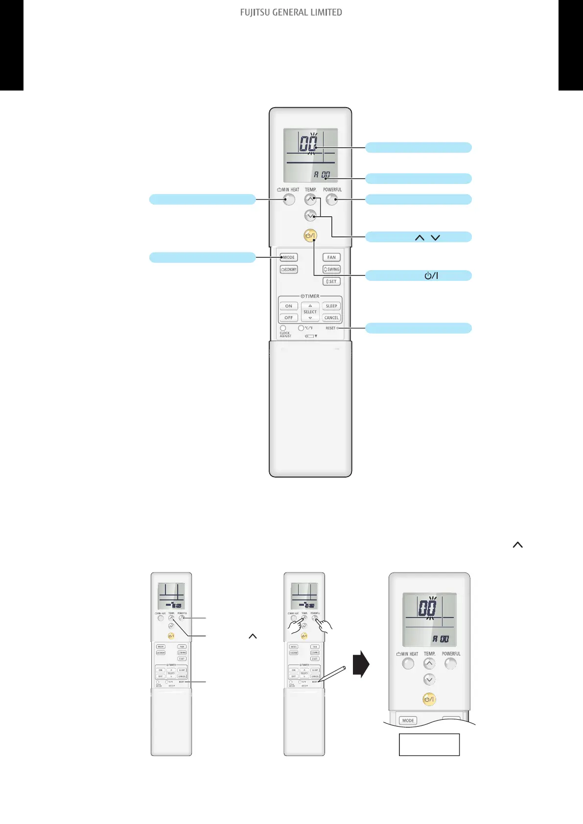 To enter the function setting mode, while holding down the POWERFUL and SET TEMP.