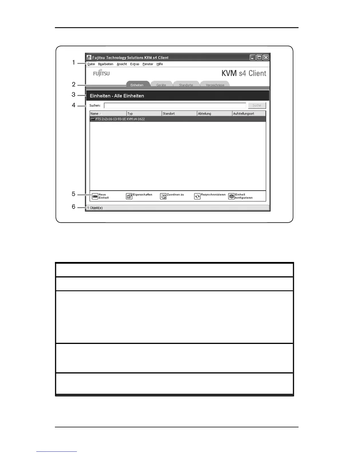 Einheitenauswahl-Fenster:Enthält die Suchleiste, Einheitenliste und