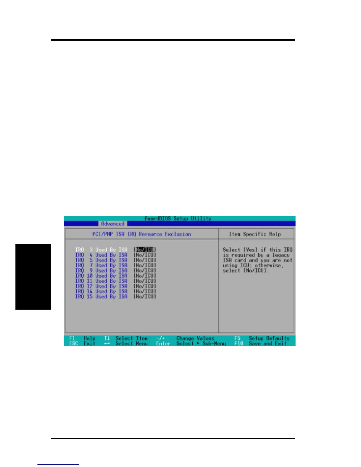 by a legacy (non-PnP) ISA card. The setting [No/ICU] for an IRQ field indicates
