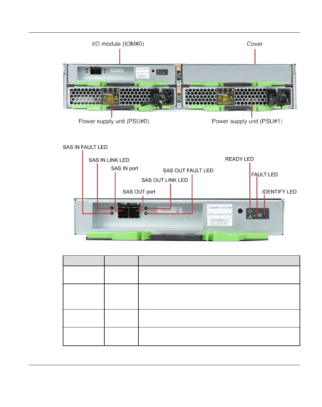 SASOUTfault amber The link between the SAS OUT port and the destination port is