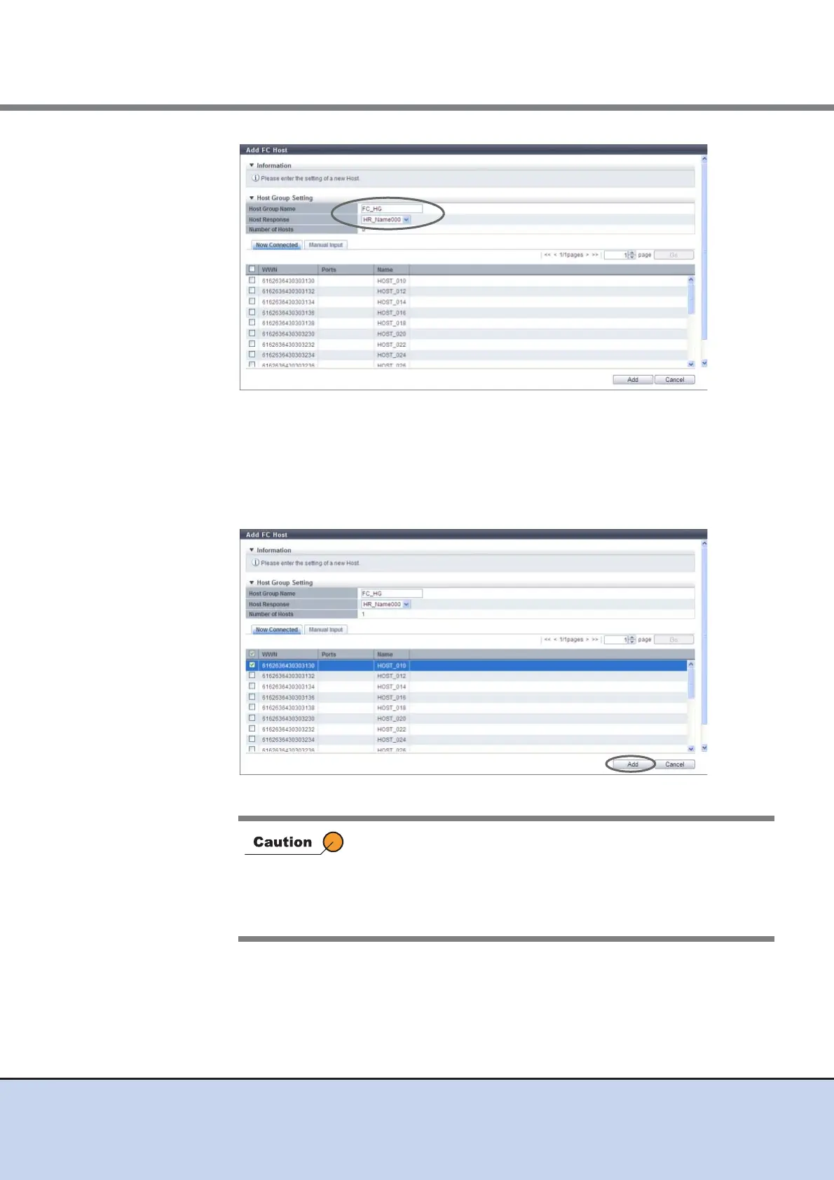 (1)Select a host to be registered from the FC host list, and click the [Add] button.
