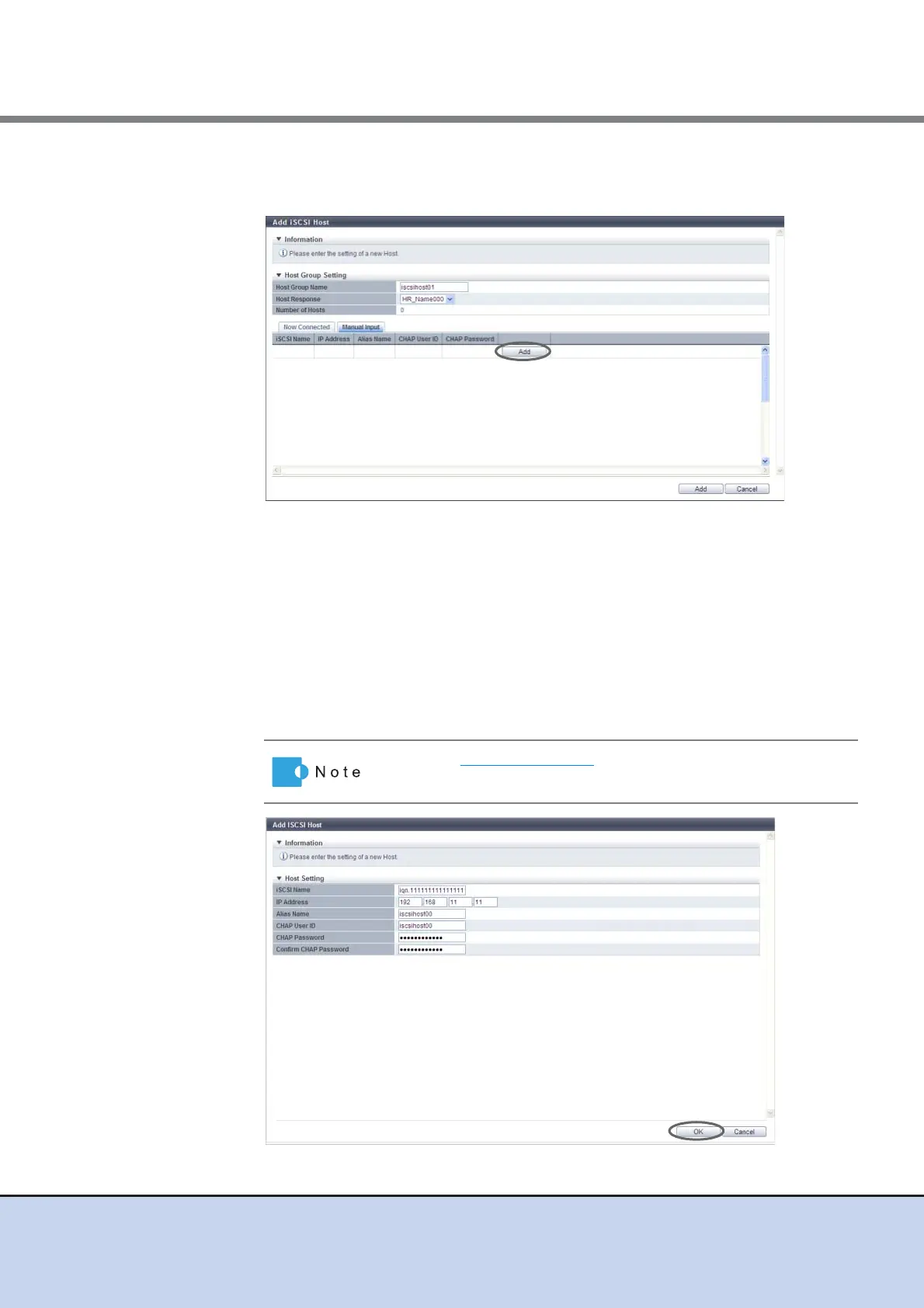 (2)Specify the iSCSI host information of the host to be registered, and click the [OK]