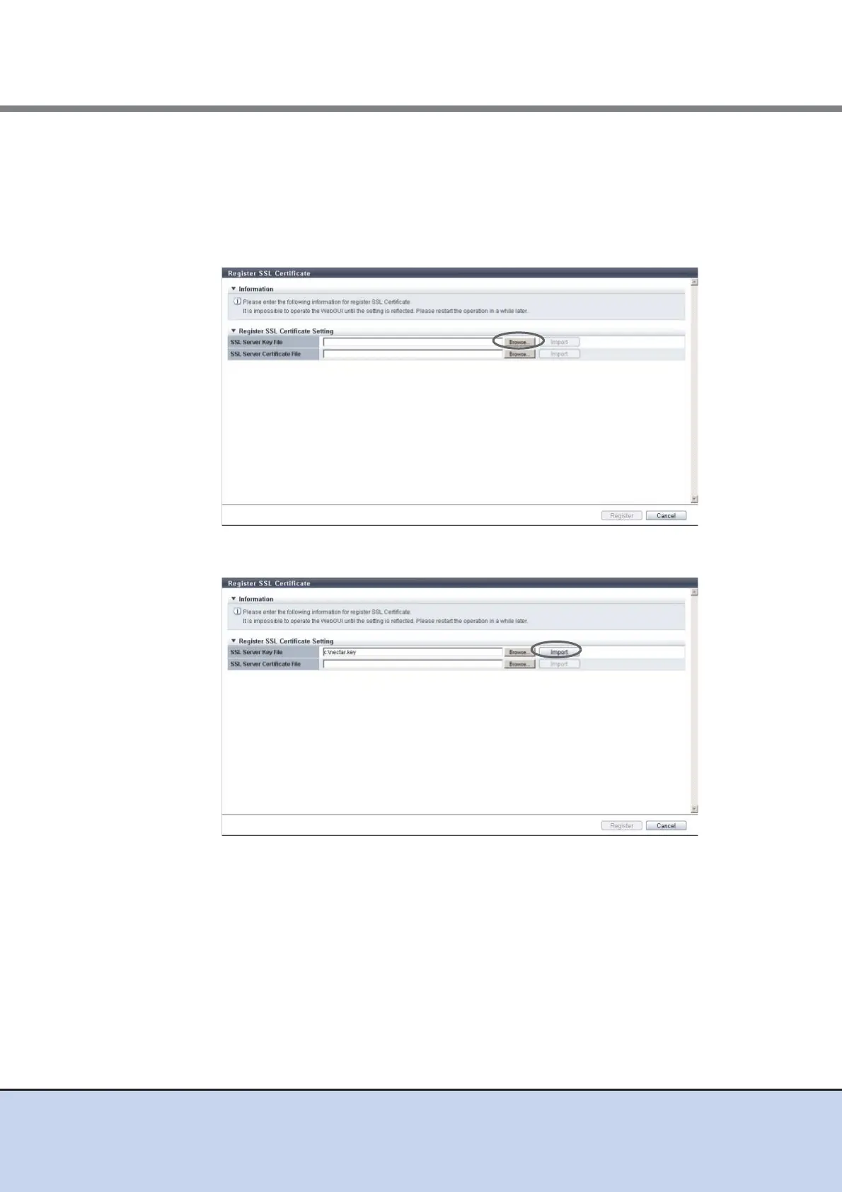 Click the [Import] button to import the SSL server key file to GUI. When importing has