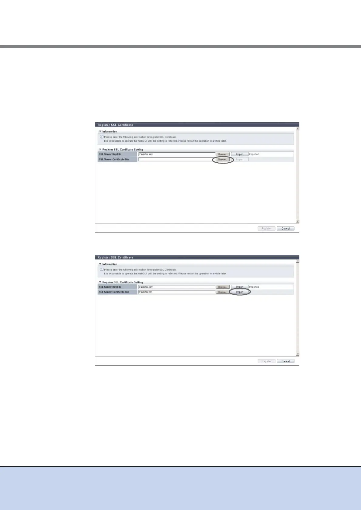 Click the [Import] button to import the SSL server certificate file to GUI. When importing