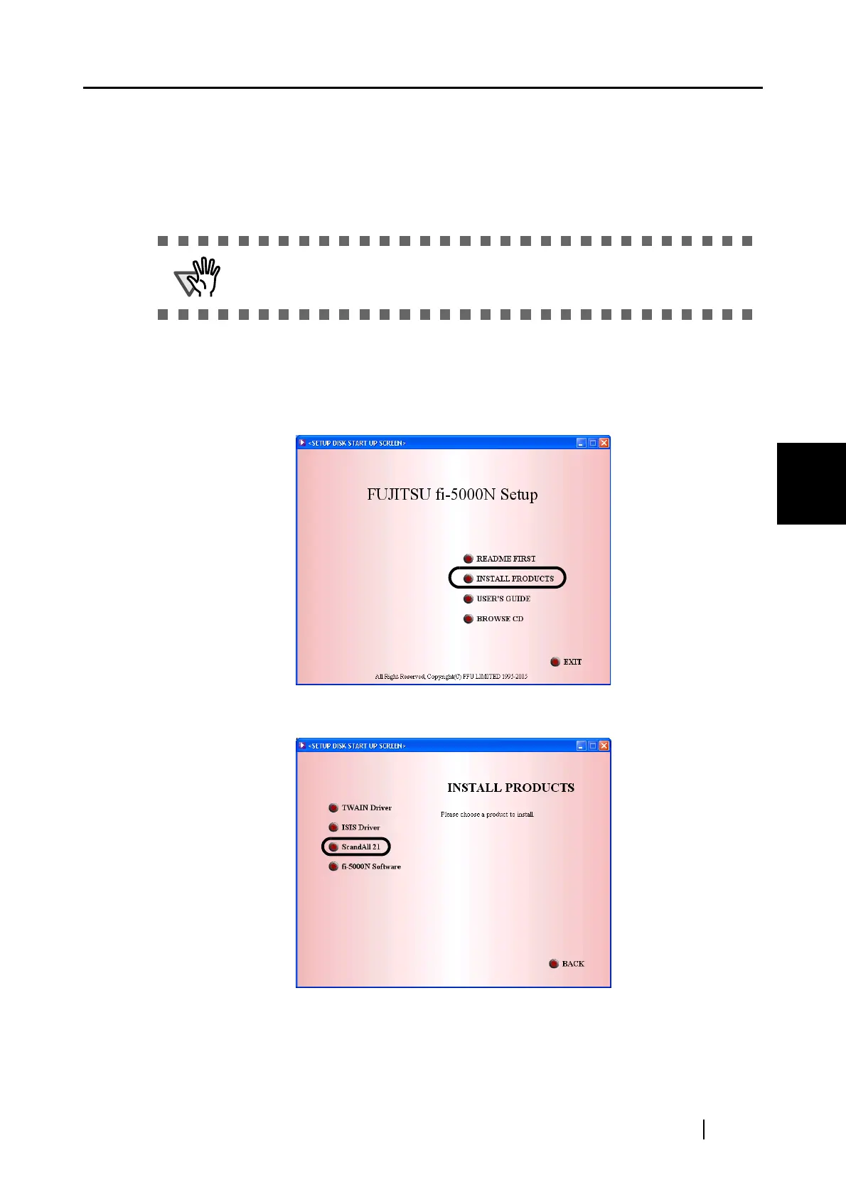 When using Windows 2000 or Windows XP, log on as a user with "Administra-