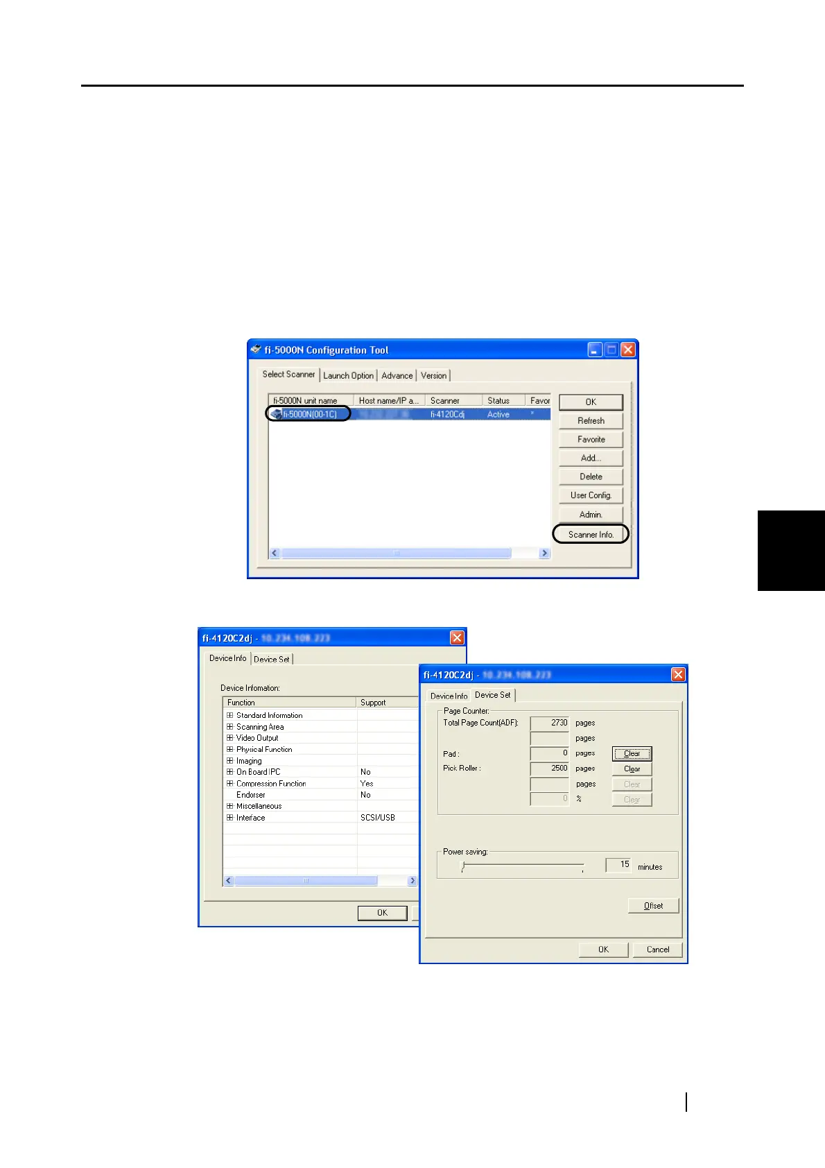 connected to an fi-5000N, reset the consumables counter, configure the power saving mode, and