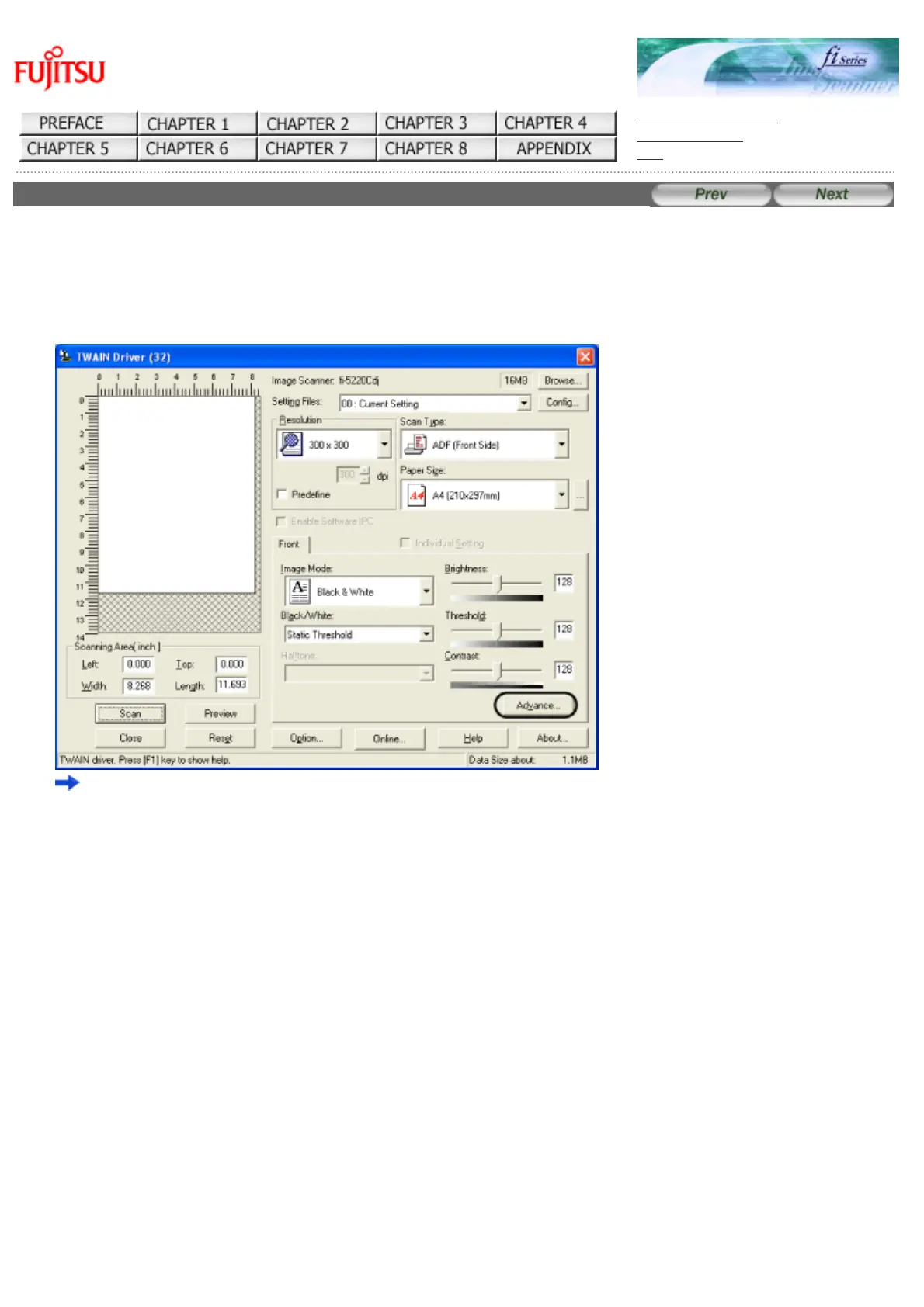 1. Click the [Advance...] button in the [TWAIN Driver] dialogbox.