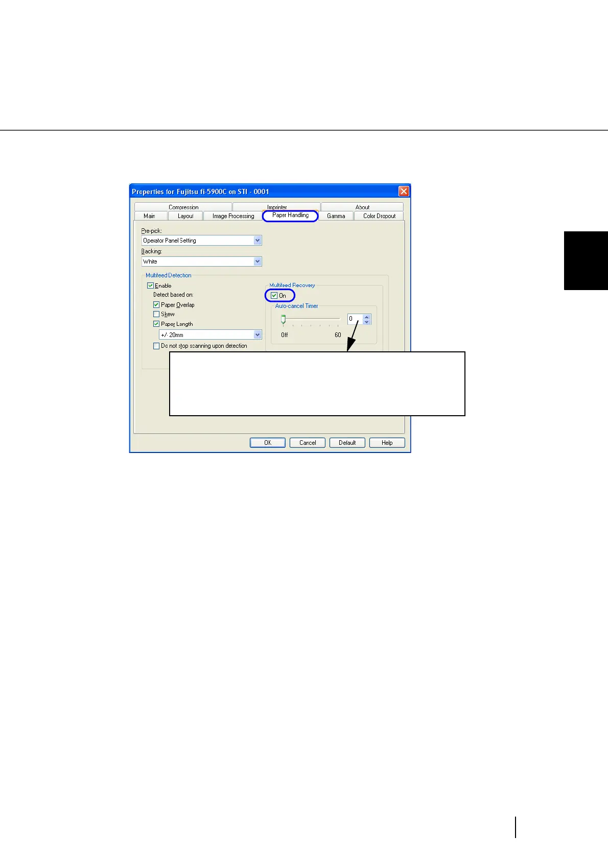 any value (minutes) on the [Paper Handling] tab of "Properties for Fujitsu fi-5900C..." dialog