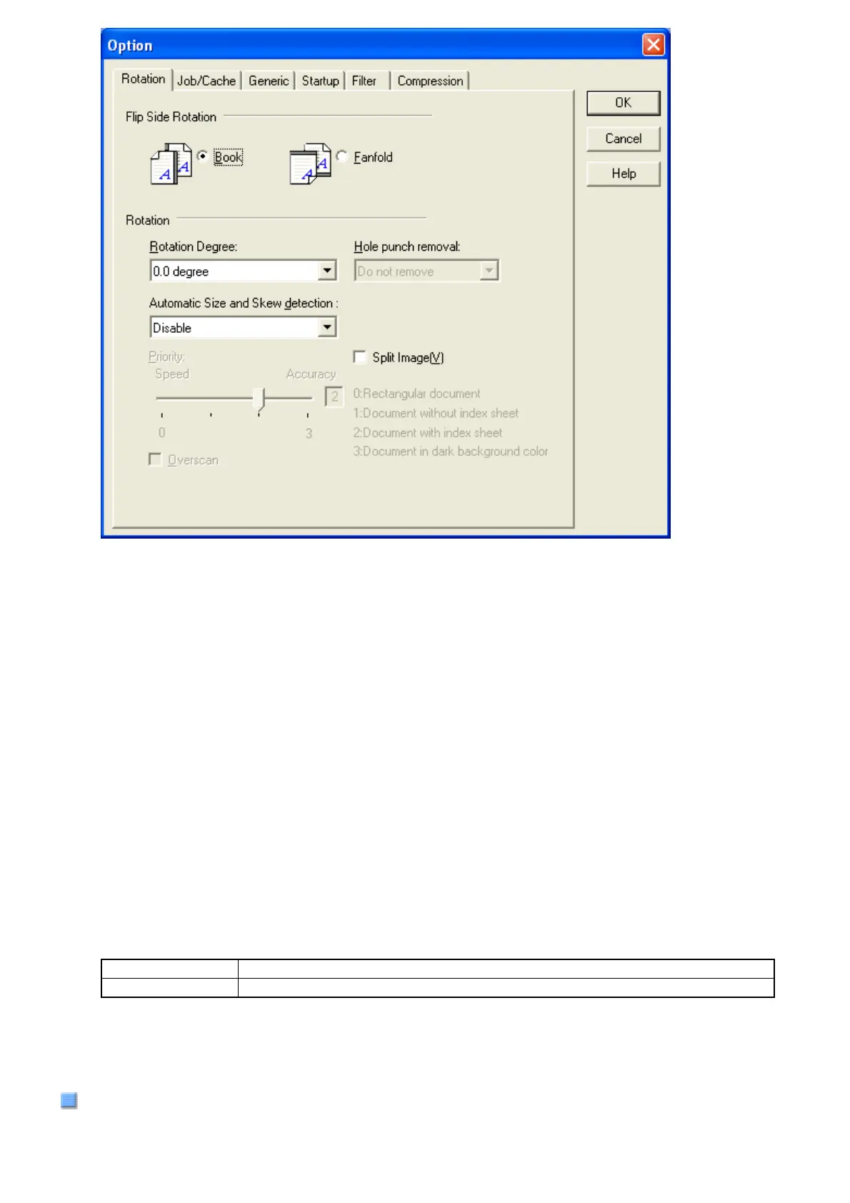 Select this tab when configuring settings for the image rotation, document size and skew detection, overscan, hole