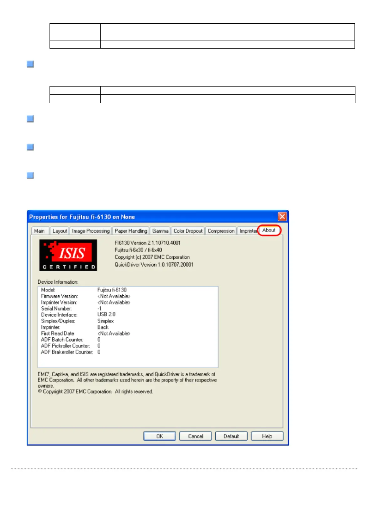 On this tab, you can view the information about the ISIS driver and the scanner connected to your computer.