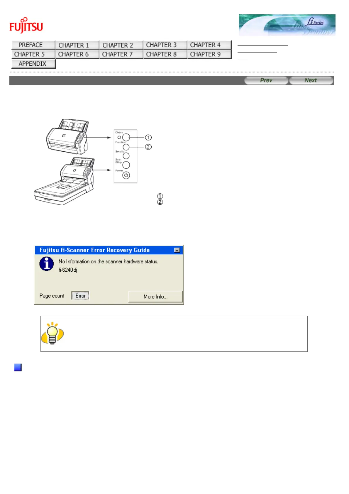 If you want to clear the error indication, press the [Scan] or [Send to] button. The scanner will return to the "Ready Status."