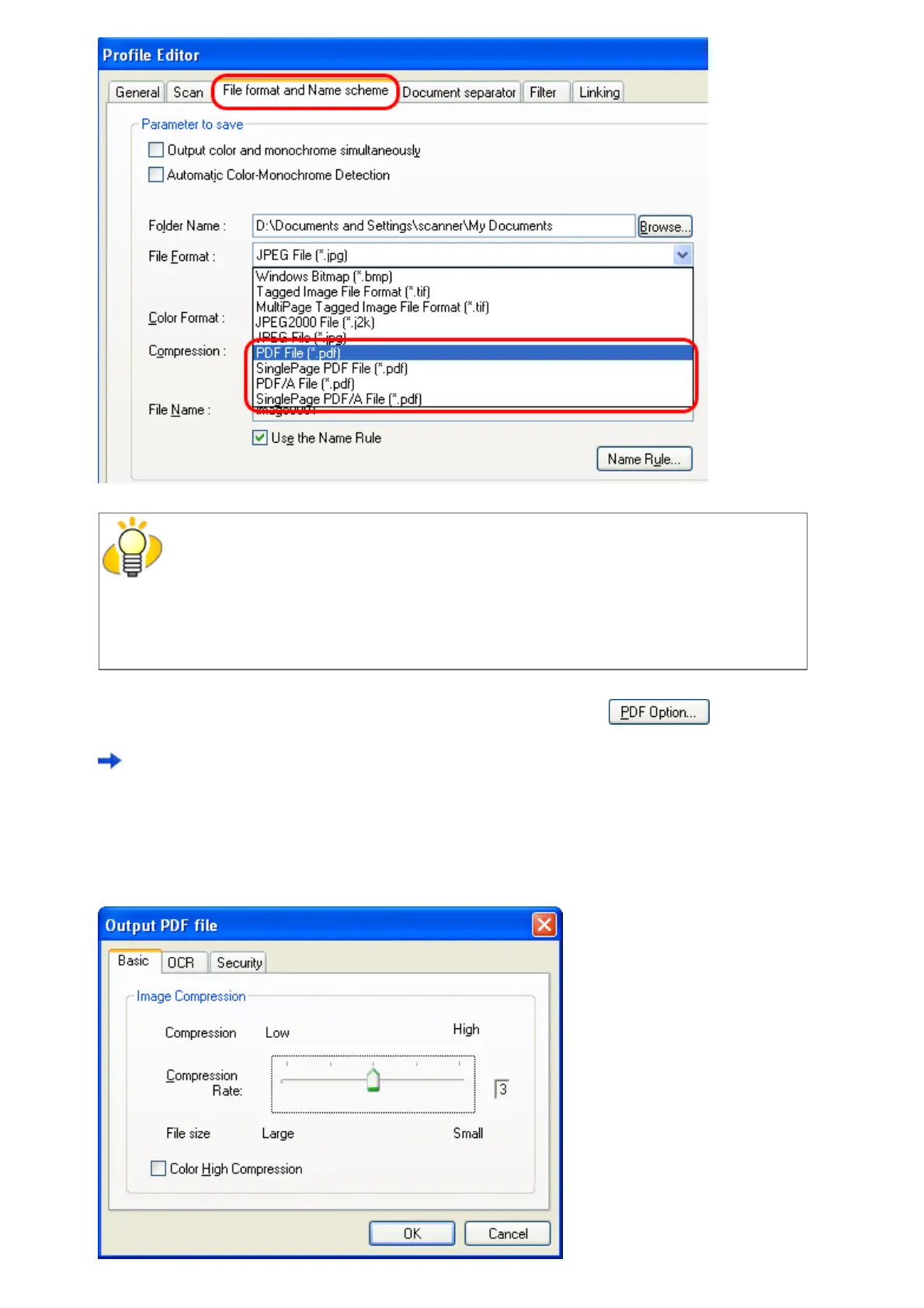 In this dialog box, you can change the compression rate, turn on the OCR function (to make searchable PDF files), and