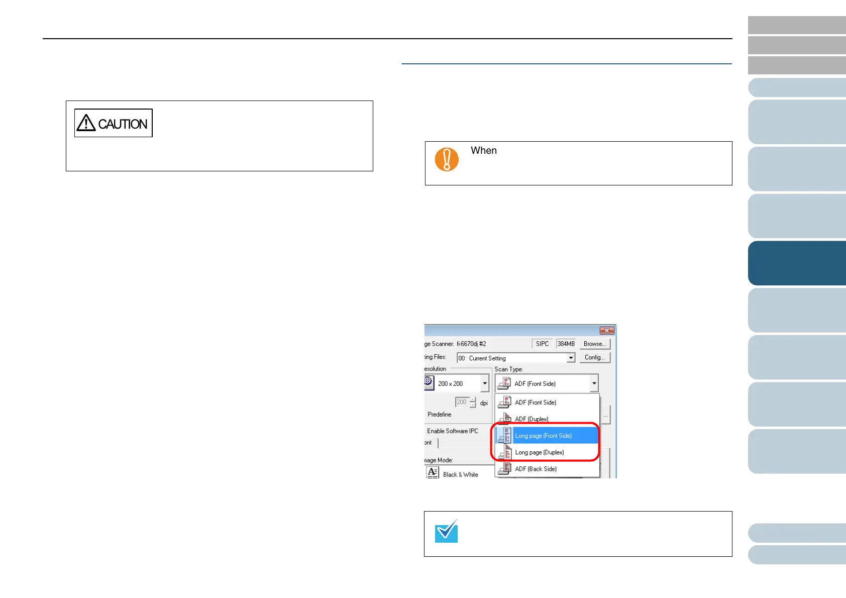 Select [Long page (Front Side)] for single-sided scanning; [Long page