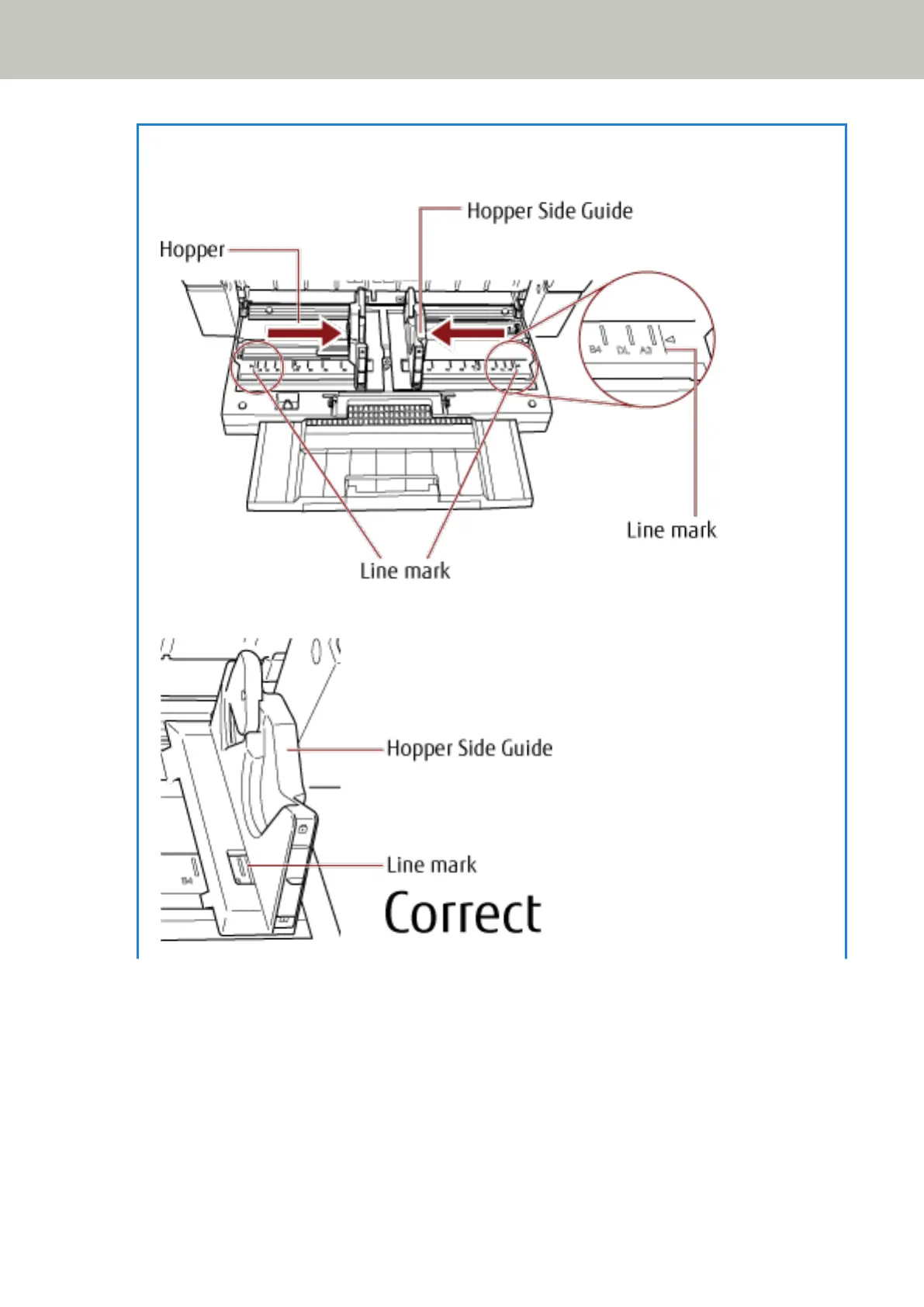 Make sure that the hopper side guides do not pass the line marks on each side of the hopper.