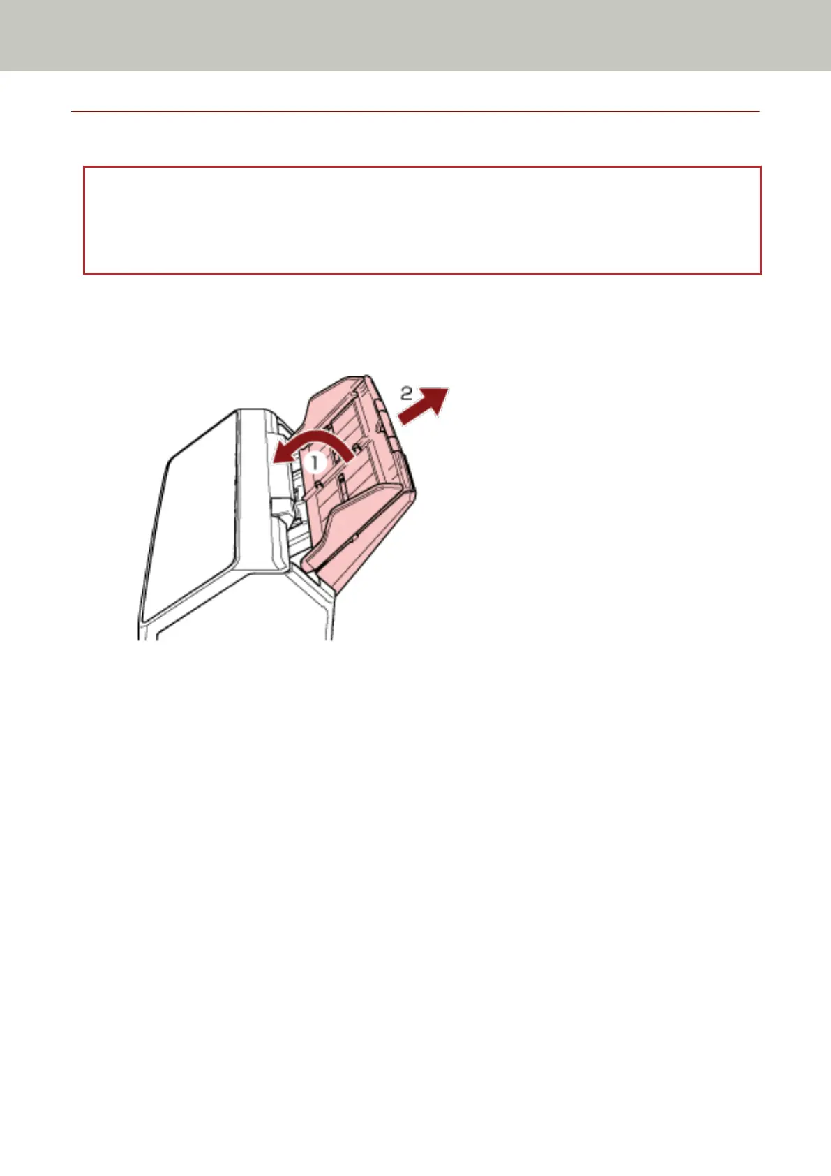 Hold both ends of the ADF paper chute (feeder), then lift it in the direction of arrow 1 and pull it out in the