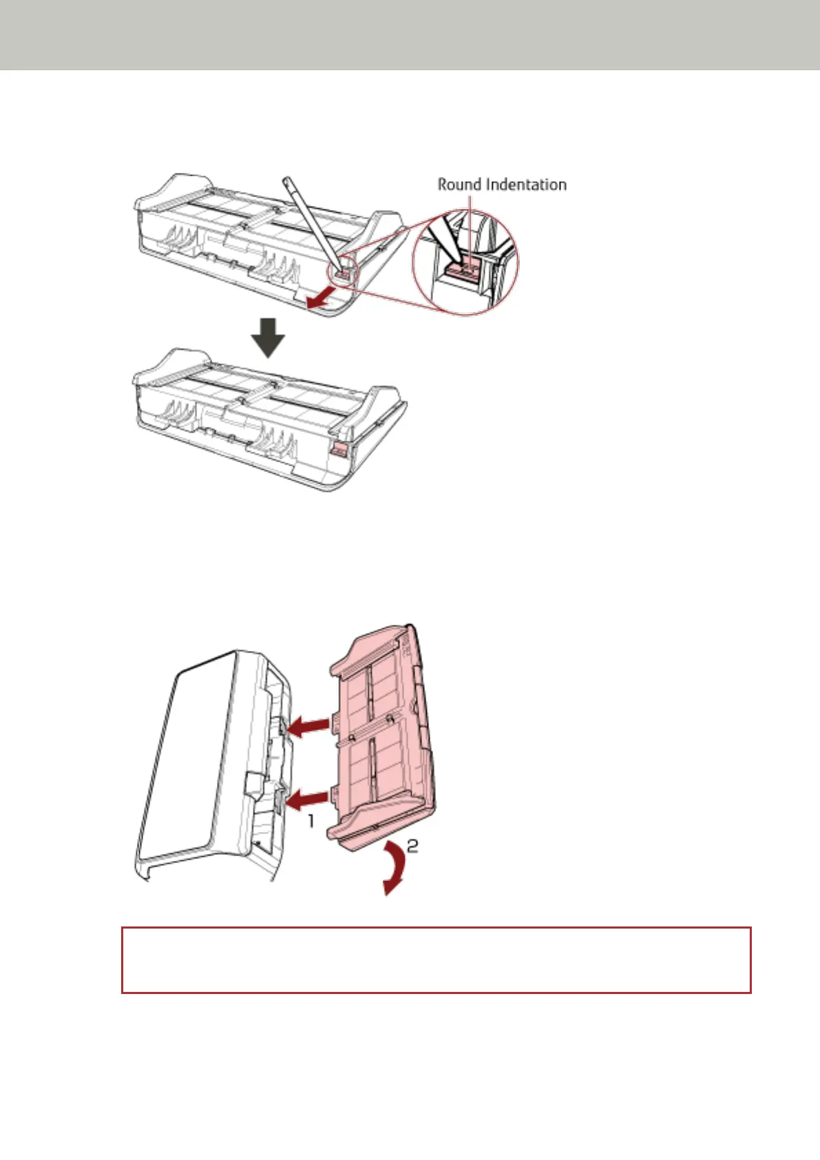 Insert the tabs into the slots on the back of the scanner in the direction of arrow 1 and tilt the ADF paper