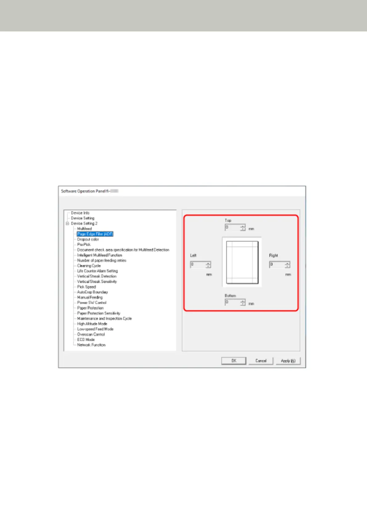2 From the list on the left, select [Device Setting 2] → [Page Edge Filler (ADF)] or [Page Edge Filler (FB)]