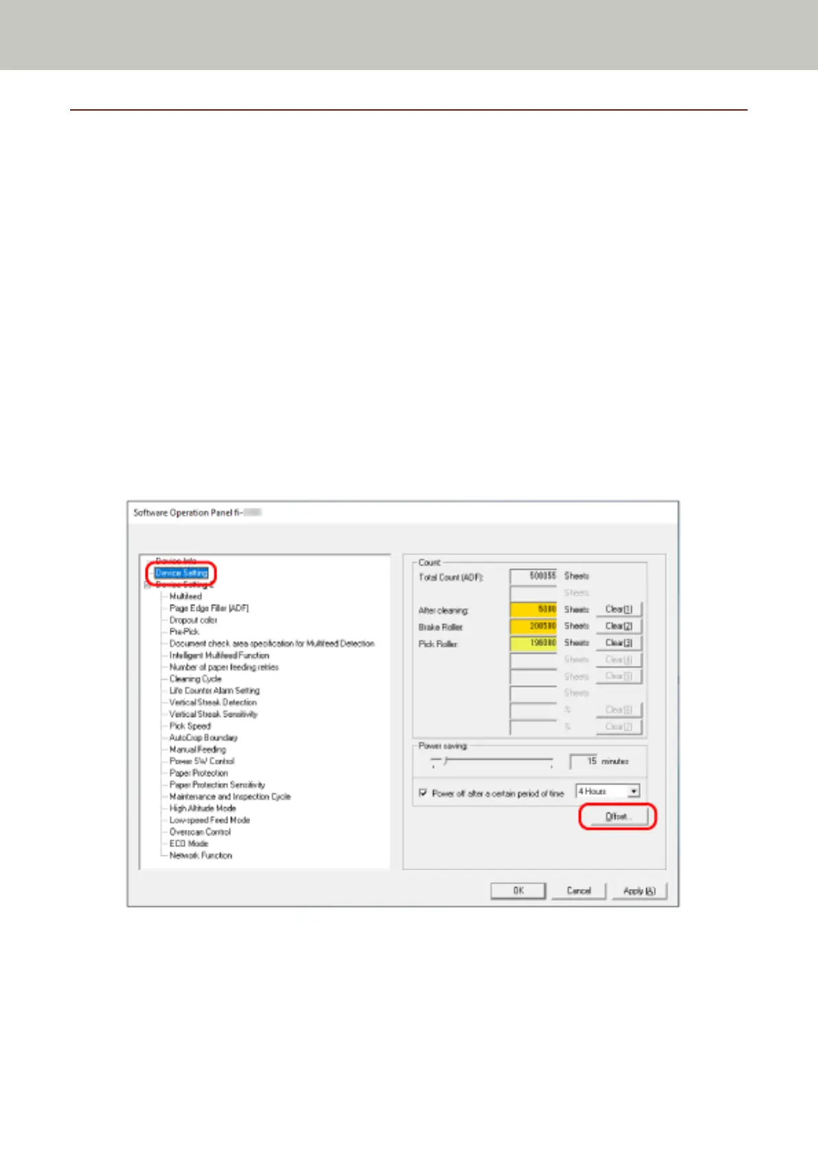 2 From the list on the left, select [Device Setting] and click the [Offset] button.
