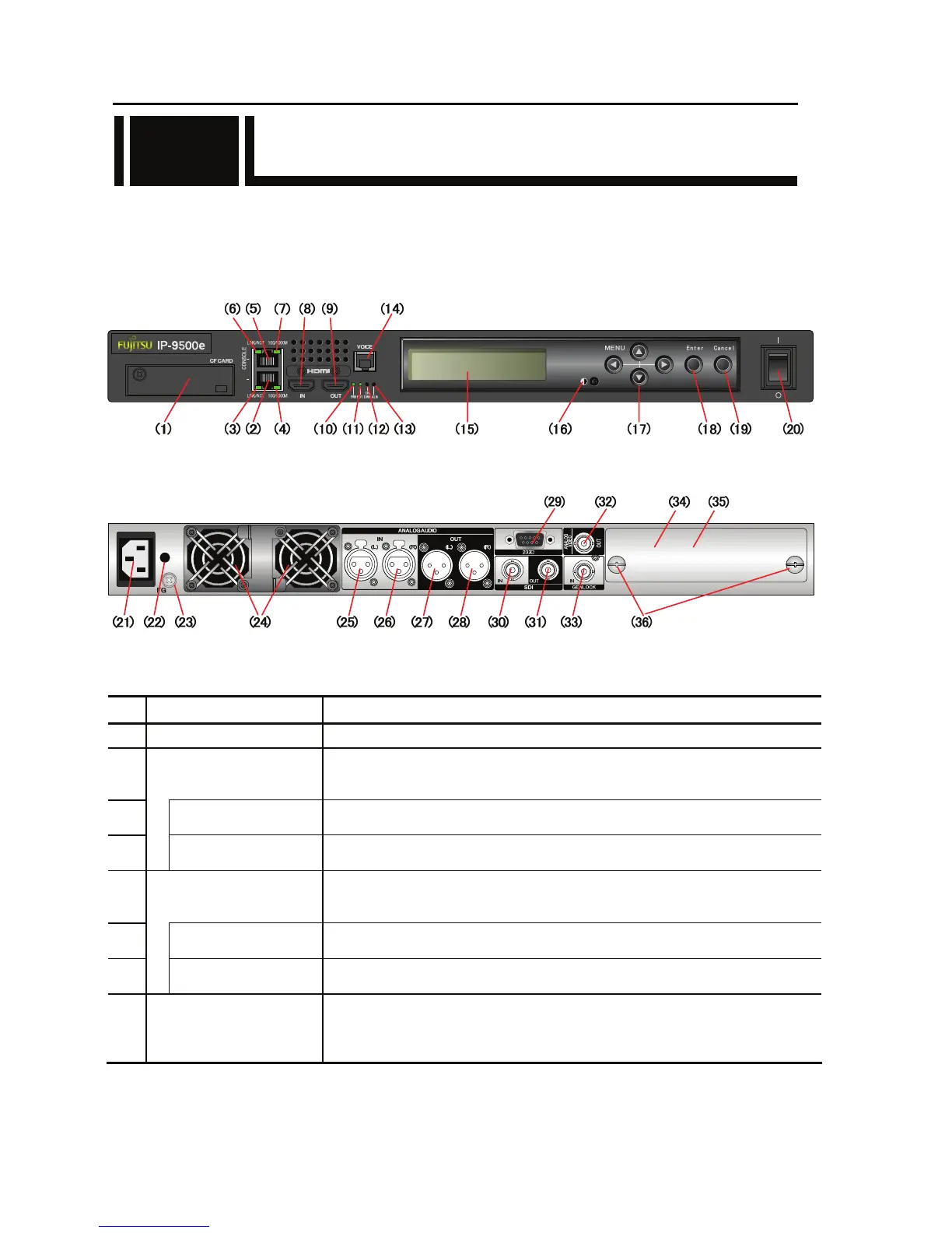 This section gives the name and describes the function of individual parts of IP-9500e.