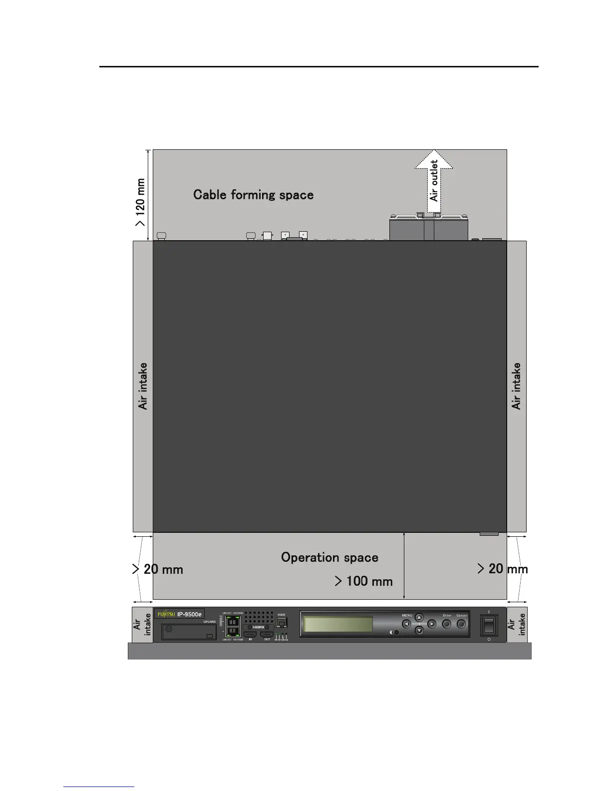 Provide the indicated (parts with hatched area) below, cable forming space, operation space and